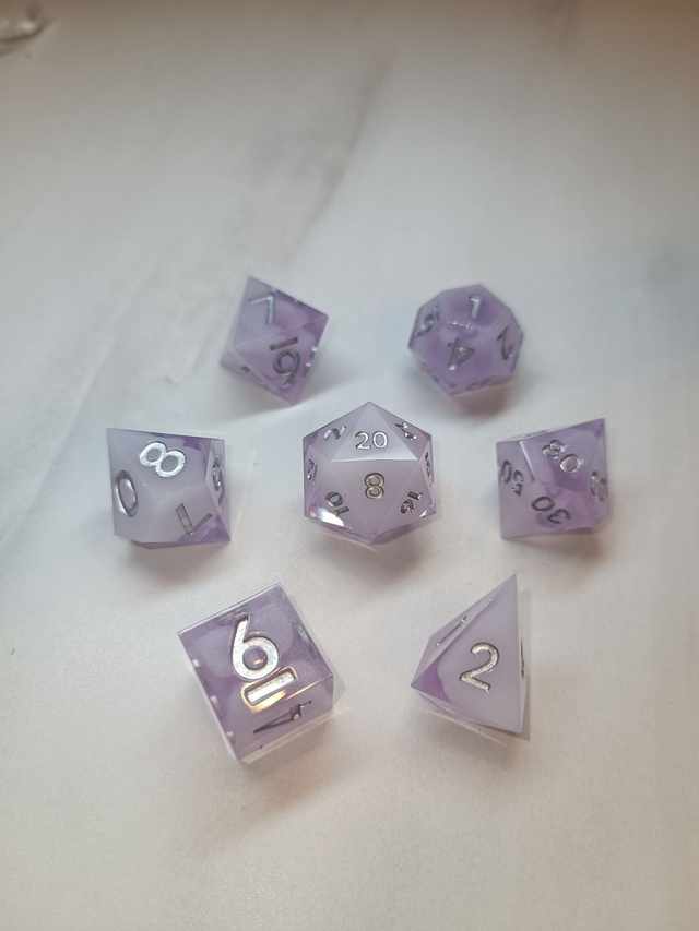 Semi-transparent dice set made with light purple mica powder and white pigment paste. Numbers are inked with silver paints.