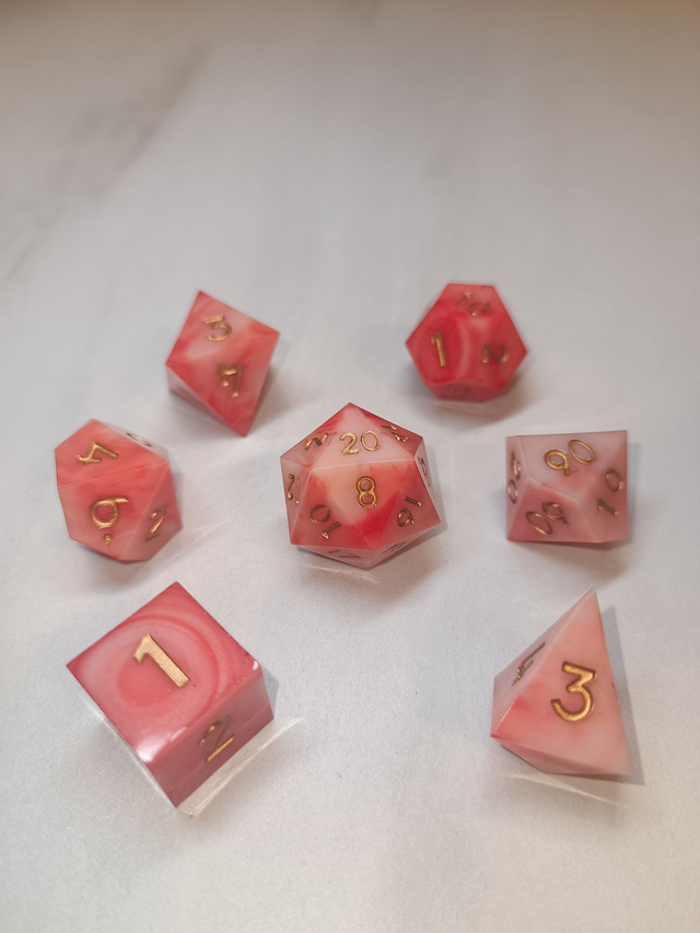 Opaque dice set made with red inks and white pigment paste. Numbers are inked with copper metallic paints.