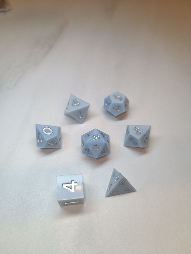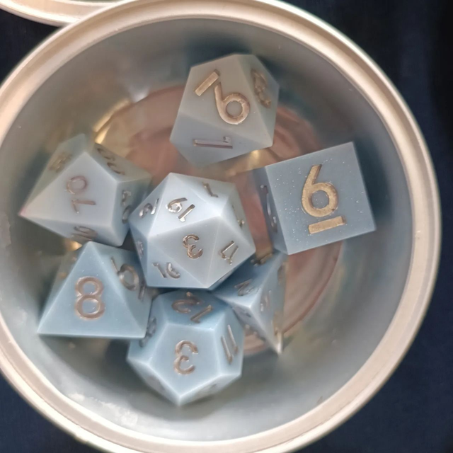 Pastel Dice Set made with blue mica powder for a subtle shimmer. Numbers are inked with silver acrylic paint.